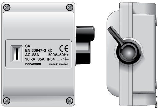 Sivusta väännettävä polykarbonaattikoteloitu Norwescon turvakytkin.