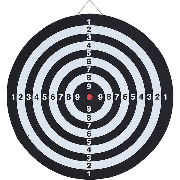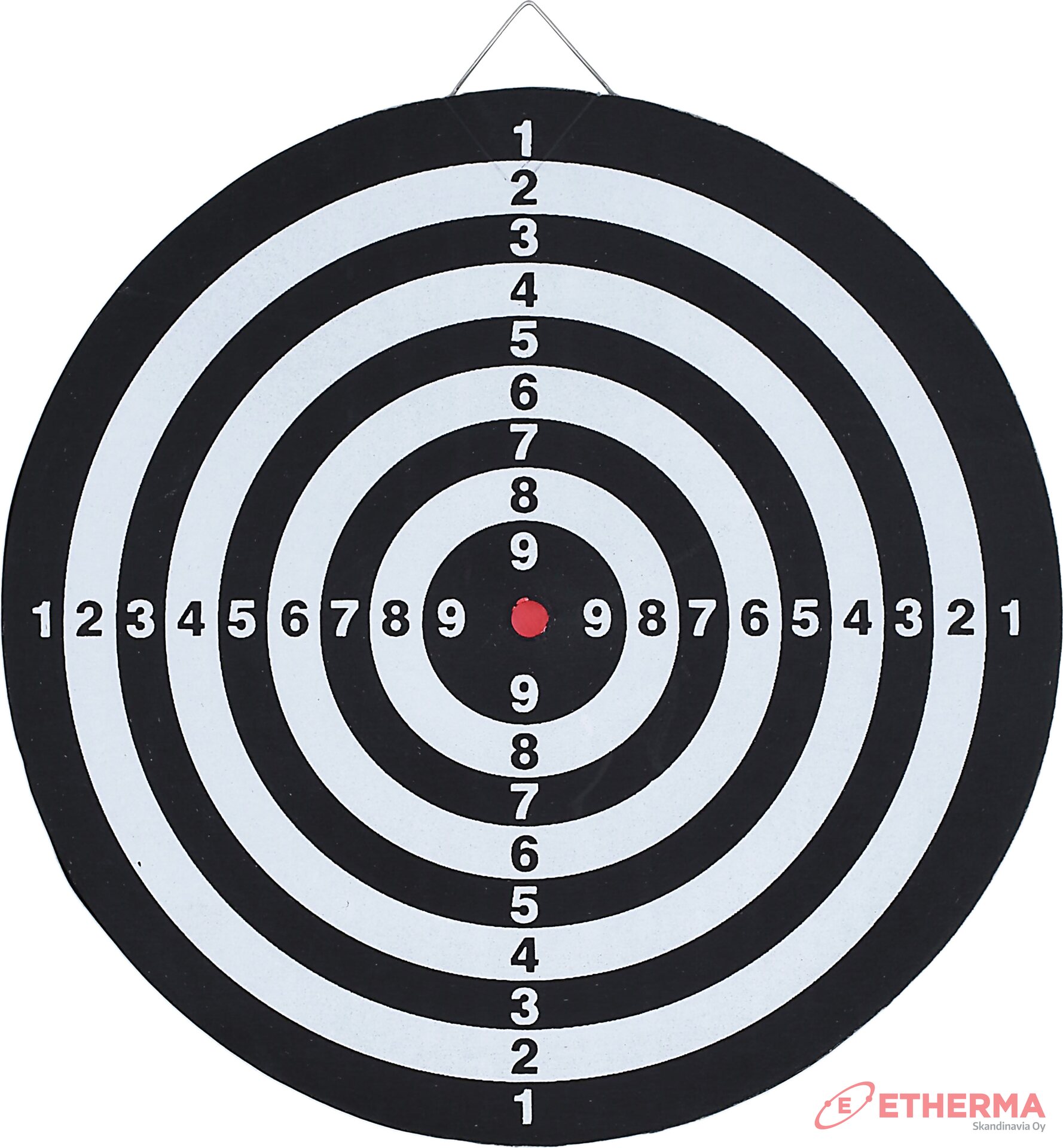 puolilla asteikko 1-10. Taulun halkaisija 355 mm, paksuus 20 mm. Tikat