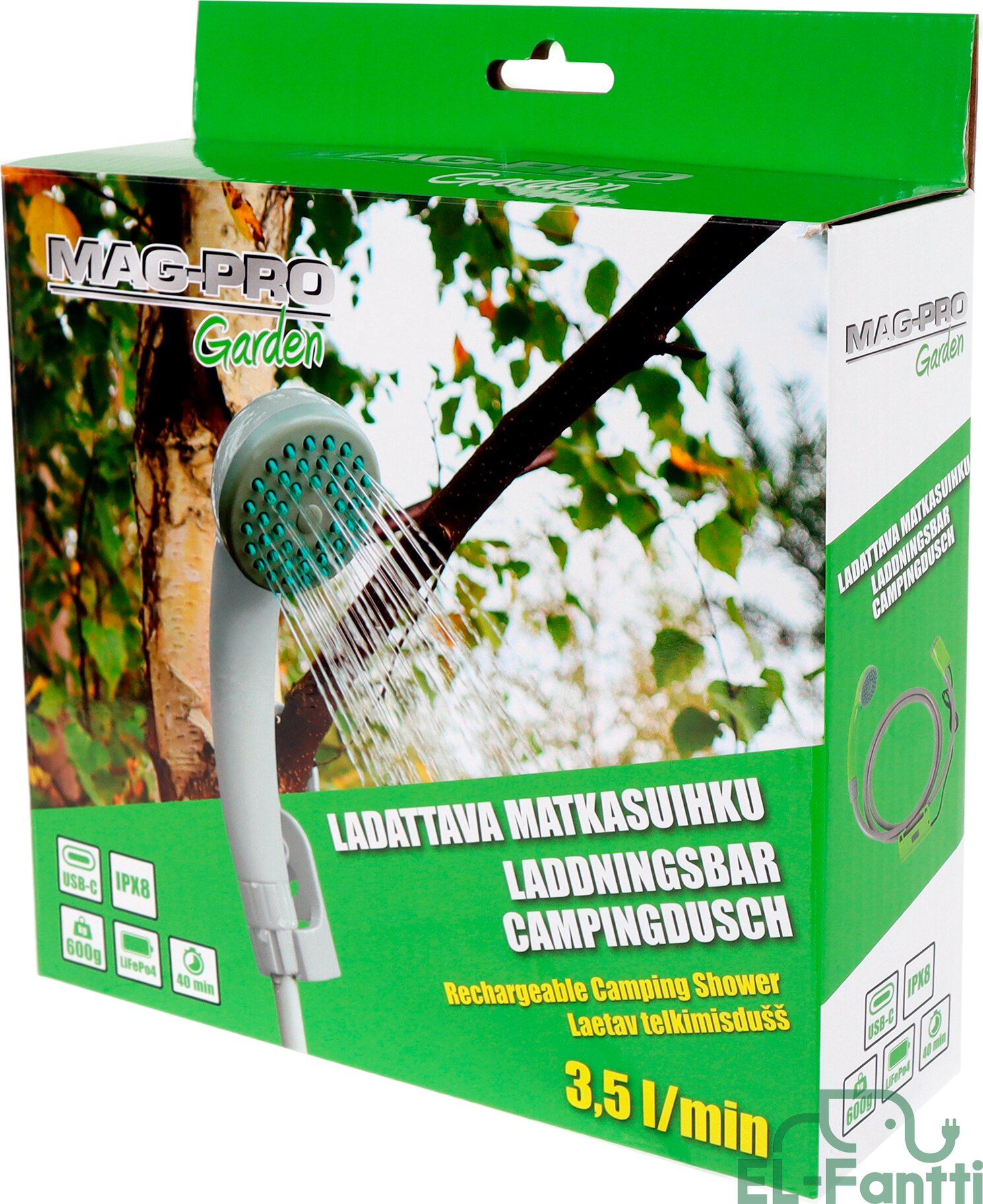 Ladattava mökkisuihku 2000mAh LFP litium-akulla. IPX8. Akkupakkaus irrotettavissa latauksen ajaksi. Pieni pumppu, mahtuu kapeampaankin vesiastiaan. mökkisuihkun teknologia minimoi veden kulutuksen, joten voit säästää huomattavasti vettä perinteisiin pesutapoihin verrattuna. Voit käyttää suihkua missä tahansa ilman tarvetta kiinteään vesijohtoon tai sähköverkkoon. Lataa akut kotona ja ota suihku mukaasi mökille, telttaretkelle tai vaikka veneelle.